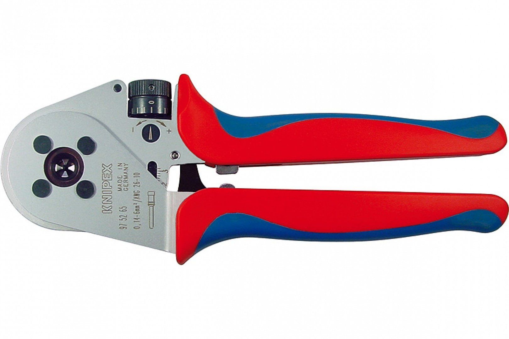 Ручной обжимник KNIPEX KN-975265 применяется для создания электрических контактов без пайки и опрессовки точеных контактов. Инструмент прост и эффективен в использовании за счет наличия направляющей для установки контактов, а так же таблицы для определения параметров регулировки. Рабочий процесс не требует больших затрат усилий благодаря удобной двухкомпонентной рукоятке, которая имеет эргономичную форму, исключая переутомление. Изделие прослужит долгое время без поломок, так как все его рабочие части изготовлены из высококачественных материалов.