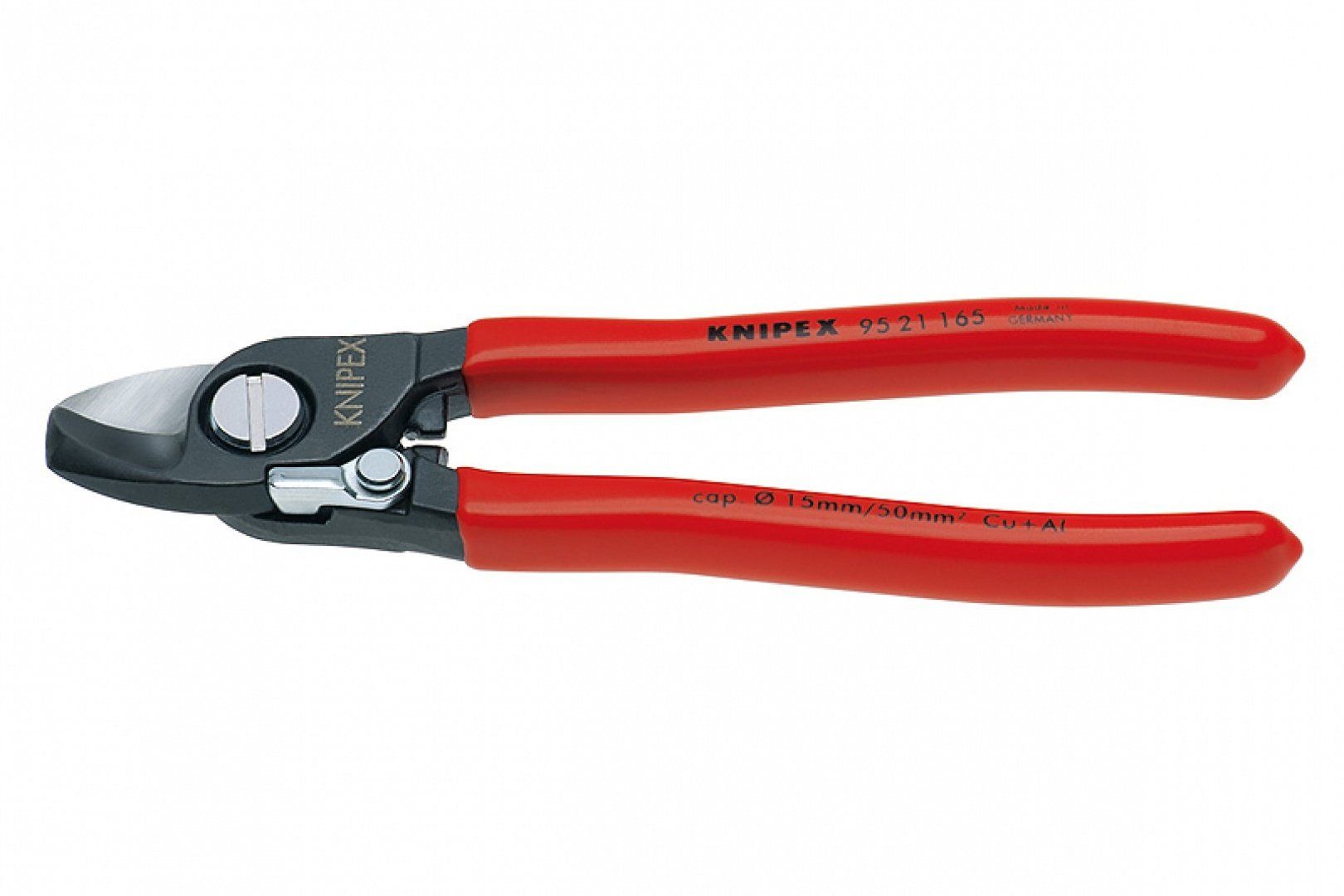 Кабелерез KNIPEX KN-9521165 с предохранительным зажимом и винтовым самофиксирующимся шарниром. Предназначен для резки медных, алюминиевых, одножильных и многожильных кабелей диаметром 15 мм и сечением до 50 кв. мм. Гладкий и чистый рез обеспечивается благодаря прецизионной шлифовке режущих кромок. Корпус изготовлен из кованой инструментальной стали, закаленной в масле, что существенно повышает эксплуатационные характеристики инструмента. Не предназначен для резки стальной проволоки и холодно тянутых медных проводов.