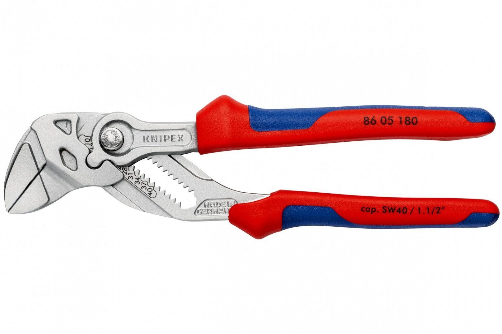 Переставные клещи - гаечный ключ Knipex 40 мм (1 1/2"), длина 180 мм, хром, 2К ручки, KN-8605180SB заменяют полный набор гаечных ключей, как метрических, так и дюймовых. Гладкие губки для бережного монтажа арматуры с высококачественной отделкой поверхностей - работа непосредственно с хромированными деталями.