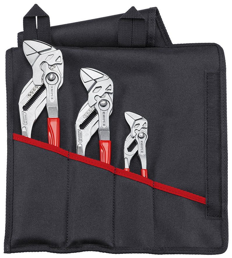 Набор переставных клещей-гаечных ключей для точного позиционирования или извлечения небольших элементов, с электростатической защитой. Практичная, износостойкая полиэстеровая сумка-скрутка для инструмента защищает ваши инструменты, а застежка с крючком и петлей обеспечивает лёгкий доступ к ним!. Каждый из этих наборов содержит по три клещей-гаечных ключей разных размеров с тонкими рукоятками с пластиковым покрытием. Как у всех клещей-гаечных ключей от KNIPEX, его гладкие параллельные губки обеспечивают надежный, но аккуратный захват - даже при работе с хромом!