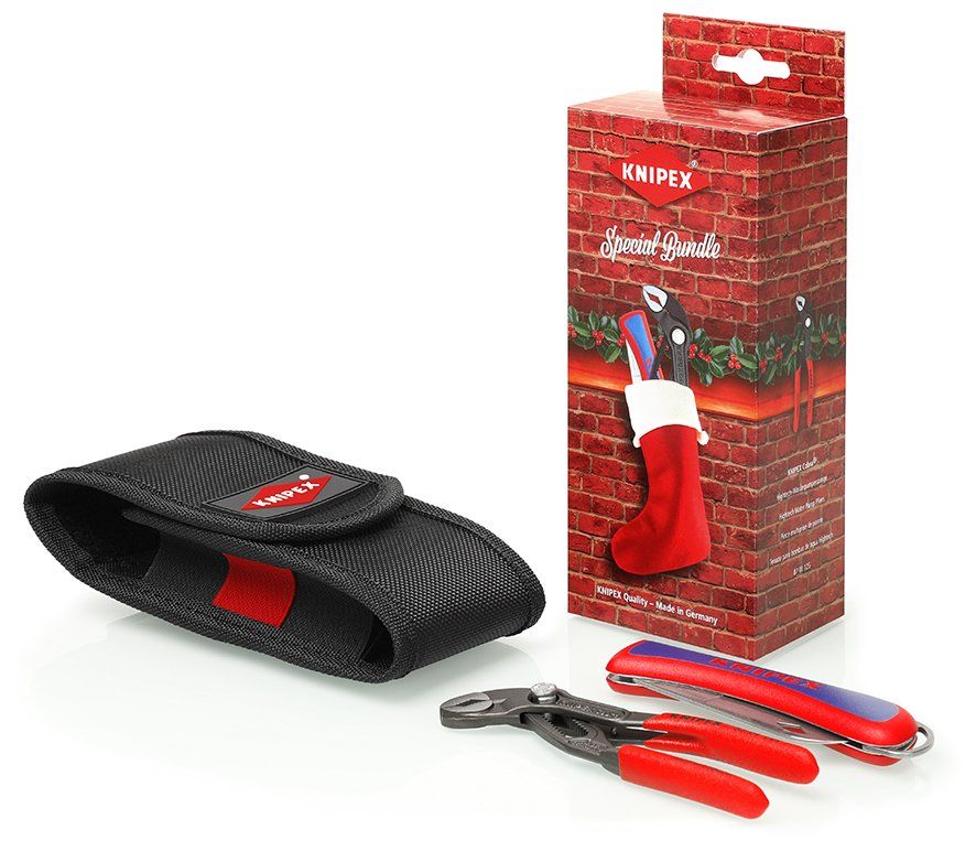 Рождественский набор KNIPEX 3 предмета KN-002072S6 сочетает в себе два в одном: высокотехнологичные переставные сантехнические клещи KNIPEX Cobra® и высококачественный складной нож от KNIPEX в виде мини-набора инструментов в прочной поясной сумке.