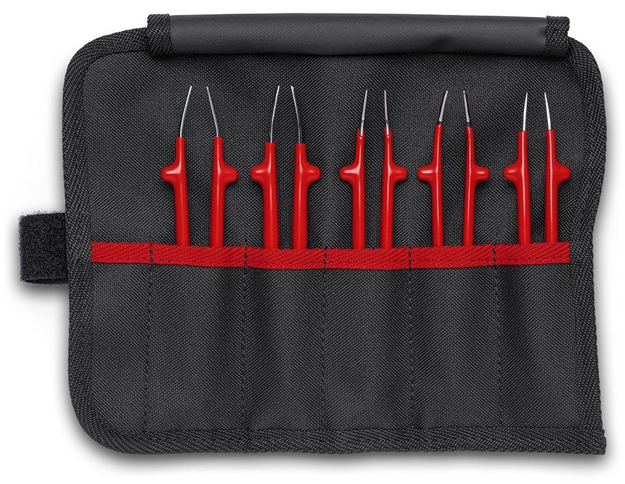 Набор универсальных пинцетов Пять высококачественных наборов пинцетов: прецизионные пинцеты, универсальные пинцеты, антистатические, пластиковые и изолированные пинцеты. Оптимальная комбинация: наборы пинцетов представлены в различных комбинациях в высококачественной инструментальной сумке-скатке для безопасной транспортировки и хранения без повреждений. Две разные инструментальные сумки-скатки: (набор VDE с 5 отделениями; другие варианты с 7 отделениями).